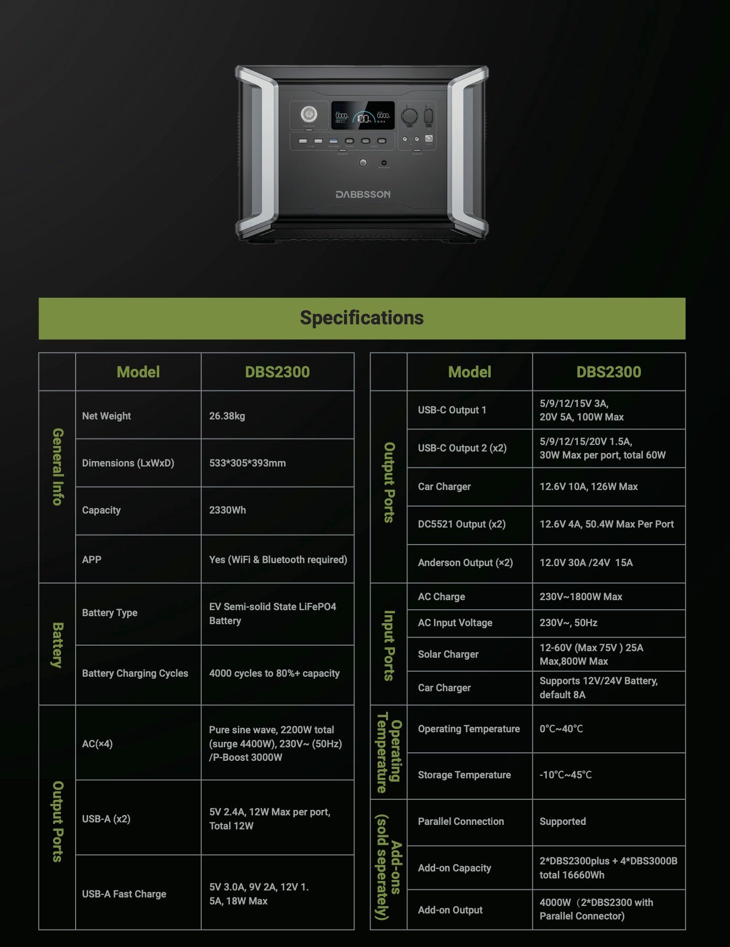 The Dabbsson DBS2300 Portable Power Station is a versatile power station designed for users who require a balance of power output and portability. With a 2200W power output and a 2330Wh battery capacity, this power station is capable of powering medium-sized de- vices and equipment for extended periods of time, making it ideal for camping trips, out- door adventures, small-scale construction projects, and backup power for the home.
